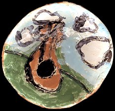 perhaps even share some audio/video in the future of her playing. Or not. Whatever SHE Well McKinley is still not ready to share her playing with audio and video Grampa Dougie, but it was my birthday recently and this (at right) is what she made for me. What makes this piece (a 6" diameter ceramic plate) of most interest to me (besides the fact that her little hands fashioned it out of clay, painted it with ceramic paint and then put it in the kiln) is that when I asked her what it was, she put her hands on her hips and announced, "Jeez Grampa, its a guitar!" Well I suppose it was a stupid question on my part but I, at first, just didn't get it. After I foolishly made my second mistake and told her I didn't recognize it as a guitar, she patiently (very kind on her part, thank you) went on to explain that it wasn't 'posed to be an actual picture of a guitar. She, instead, was attempting to create her impressions and feeling of the sound and overall ambience (my word - not hers) of an acoustic guitar. She said the sound hole was disproportionately (my word also) large since that is where all the sound comes out and the neck and strings sort of bend away up into the sky and clouds as that is where all the magic happens. Boy, did I feel dumb and not at all hip to art. The fact is, what she created was an impressionist's view of the magic of the instrument worthy of the Picasso school of weird, but often incredibly insightful ART. If she continues to think of the instrument in such magical ways, who knows what magic those still little fingers may one day produce. Thought I'd share this with you as you worry, in your grown up ways, over how much to spend on a guitar and who makes good ones and who doesn't. The fact is, in the right hands they are all magic, some perhaps less than others, but magic nonetheless. And magic, as is beauty itself, is in the absolute eye of the beholder. Santa Claus, The Easter Bunny, The Great Pumpkin, and Picasso. What a group for a session. I hope it remains always so - to all of you and your offspring who shall descend. |